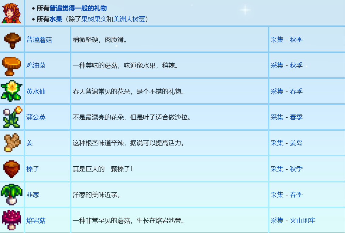 玛尼的喜欢礼物有很多种,主要是一些食物和饮料,以及一些动物相关的物品。例如,她喜欢所有的鸡蛋和牛奶,不管是什么颜色和大小。玛尼也喜欢一些美味的食物,如意大利面、烤鱼、玉米、沙拉、披萨和巧克力蛋糕。饮料可以选择如蜂蜜、蛋黄酱、啤酒和蓝调爵士。此外还喜欢一些自然的物品,如香豌豆、大蒜、防风草和石英。