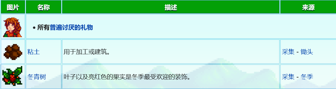 玛尼的中立礼物没有,她对所有的礼物都有一定的反应,不会完全无视。玛尼的讨厌礼物有两种,分别是野山葵和海藻。这两种物品都是海洋相关的,可能是因为她不喜欢海鲜的味道。玛尼的厌恶礼物有两种,分别是石头和冬青树。这两种物品都是无用的杂物。