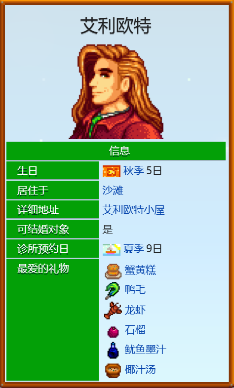 夏季:周二的时候,他会去诊所,周四和周五的时候,他还是会去皮尔斯的杂货店,其他的时间,他会去莉亚家附近,似乎对她很感兴趣。秋季:周四的时候,他仍然会去皮尔斯的杂货店,周五的时候,他会回到家上面的桥上发呆,周日的时候,他会去鱼店的码头看海,其他的时间,他会去图书馆,可能是在做研究或者借书。冬季:和秋季差不多,不同的是周日的晚上,他会去沙龙喝酒,可能是为了取暖或者放松。最爱:龙虾、石榴、喜欢:防风草、生鱼片、推荐:防风草,生鱼片(前期)、石榴(后期)。