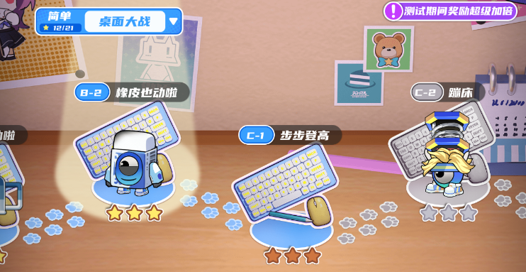 游戏整体的画风是偏向于卡通类的,在对战中,大家会看到很多风格不一的关卡地图,而不同关卡中刷新出来的机器人怪物也都不一样,又机械风格的,还有甜品风格的,看起来非常的亮眼!