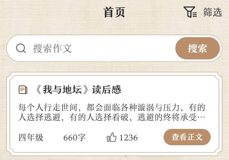 它包含了多个不同阶段的作文,同时汇聚了大量的素材给到大家,让用户能获得一个良好的体验,不论是写人还是写景,都可以快速的解锁使用,此外在它的作文库里面也是会大家准备了许多的素材,让小伙伴们能快速的进行选择。