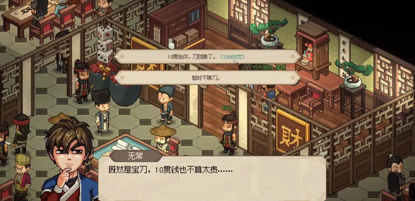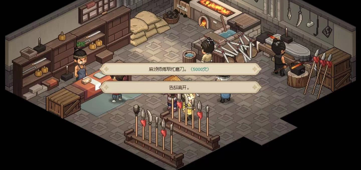 如果玩家此时银子数目不足,也可以先去其他地方将钱赚足(要多赚5000文磨刀),之后等有足额的银子后再来找老板拿刀。由于玩家拿到的刀已经锈迹不堪,因而玩家在将菜刀交还给庖春秋前,还要先去一趟铁匠铺花5000文请铁匠帮忙把刀磨一下。待刀磨好后生锈的菜刀就会变成玄铁菜刀,此后玩家只需将刀还给庖春秋,就能完成整个任务,同时庖春秋与玩家的亲密度将会上升到知己。