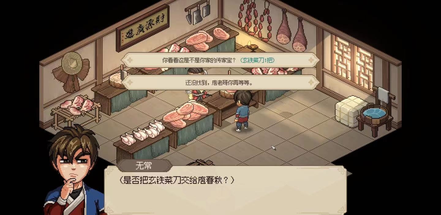玩家先来到大梁城肉铺找庖春秋,并在对话结束后将其亲密度提升至59点(给他任何食材都行),随后便能得知他将玄铁菜刀拿去换银子了,而玩家要做的就是帮他把菜刀找回来。接下来,玩家需要去当铺、铁匠铺打听菜刀的线索,最后来到长乐柜坊找到老板,用10两银子将菜刀赎回来。