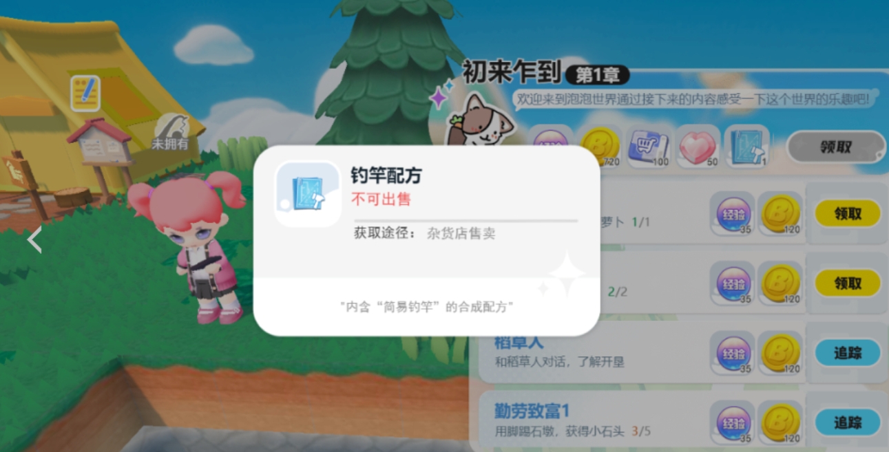 钓鱼首先需要获得钓竿,钓竿在开局阶段是没有办法得到的,因为它需要先获取配方然后进行合成,虽说获取途径上写了个杂货店售卖,但在第一章的任务完成之前,其实杂货店货架上依然是没有的,所以前面大家先打完第一章,这样可以直接获取系统送的一个钓竿配方。