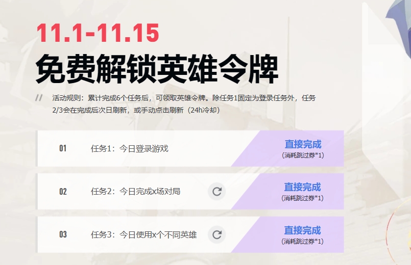 任务性质的奖励除了这个喷漆以外,还有英雄令牌,这个令牌所需要耗费的时间就更多了,它需要你共计完成六个任务,这些任务包括了登录游戏,完成对局,以及使用多个英雄等等,总之都必须是亲自进游戏玩了一定时间后才能完成的任务。