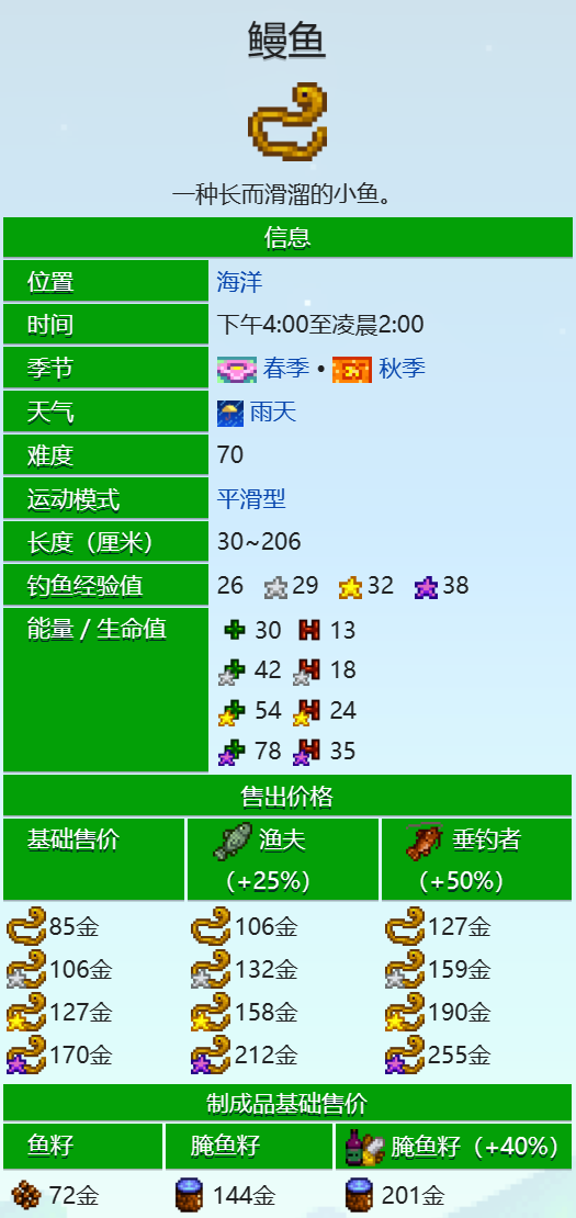鳗鱼只有在春季和秋季的雨天才会出现,而且只能在海洋里钓到。具体的时间段是从下午4点到凌晨2点,也就是游戏内的夜晚。所以说如果想钓到鳗鱼需要注意天气预报,选择合适的季节和时间去海边垂钓。鳗鱼的难度为70,运动模式为平滑型,所以需要有一定的钓鱼技巧和耐心才能成功钓上来。