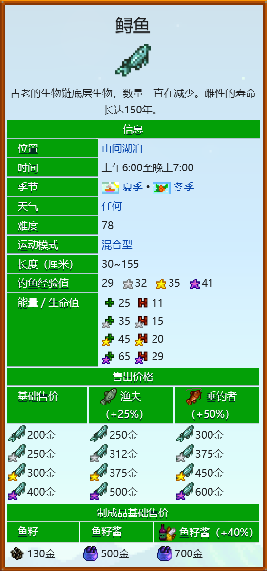 鲟鱼只会在夏季和冬季的白天(上午6点至晚上7点)出现在山间湖泊中。山间湖泊是指矿山区域的湖泊,也就是矿洞门口的那个湖。鲟鱼的出现概率与天气无关,但是在夏季的雨天会稍微高一些,而在冬季使用雨水图腾得到的降雨中会变得少见。另外,鲟鱼也可能在每周三的科罗布斯商店里随机出现以200金的价格售出,或者在旅行货车以600-1000金的价格售出,但是这种情况比较难遇到,所以还是靠自己钓比较靠谱。