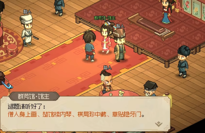 在群芳馆中,除了棋局珍中藏之外,还有其他三个不同的谜面,这四个谜面分别对应着游戏中四个不同的场景,而且场景和所需要的物品在谜面中基本上都会直接给出玩家,只需要在游戏中到达特定的地点进行物品寻找就可以,比如僧人身上画,直接就是去破庙寻找僧人身上带的溪山行旅图,楚馆楼内琴需要玩家去群芳馆的一楼寻找把琴,草贴隐牙门指的就是玩家需要去寻找率意帖,这个物品所在的位置就是衙门的书房。