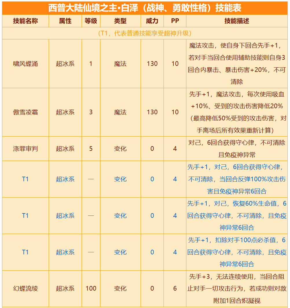 白泽的技能主要分为两类:一类是以魔法攻击为主的技能,如啸风蝶涌、傲雪凌霜、白泽星陨等,这些技能都有一定的先手优势和暴击效果,可以造成大量的伤害,并且有吸血、回复、反弹等辅助效果;另一类是以变化为主的技能,如涤罪审判、幻蝶流绫、玄瑞镇邪等,这些技能都可以给白泽提供一定的防御和免疫效果。