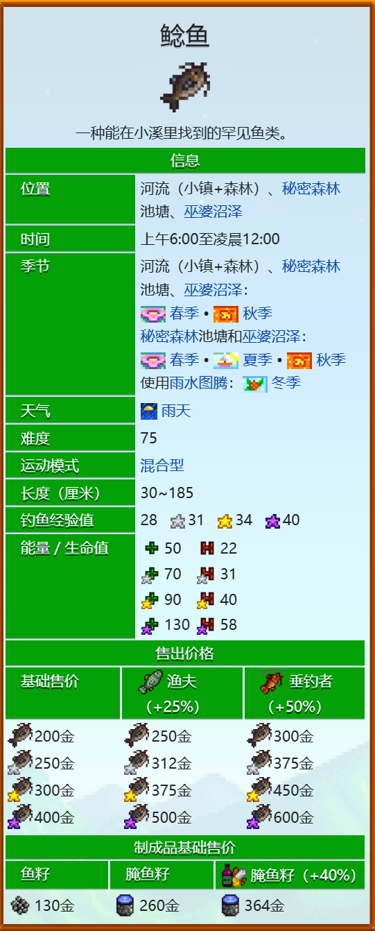 鲶鱼的长度范围是30~185厘米,它的售价是200金,如果你有渔夫或者垂钓者的技能,你可以卖出更高的价格。你也可以把鲶鱼放在鱼塘里,它会产出深灰色的鲶鱼鱼籽,你可以用它们来制作生鱼寿司或者腌鱼籽。