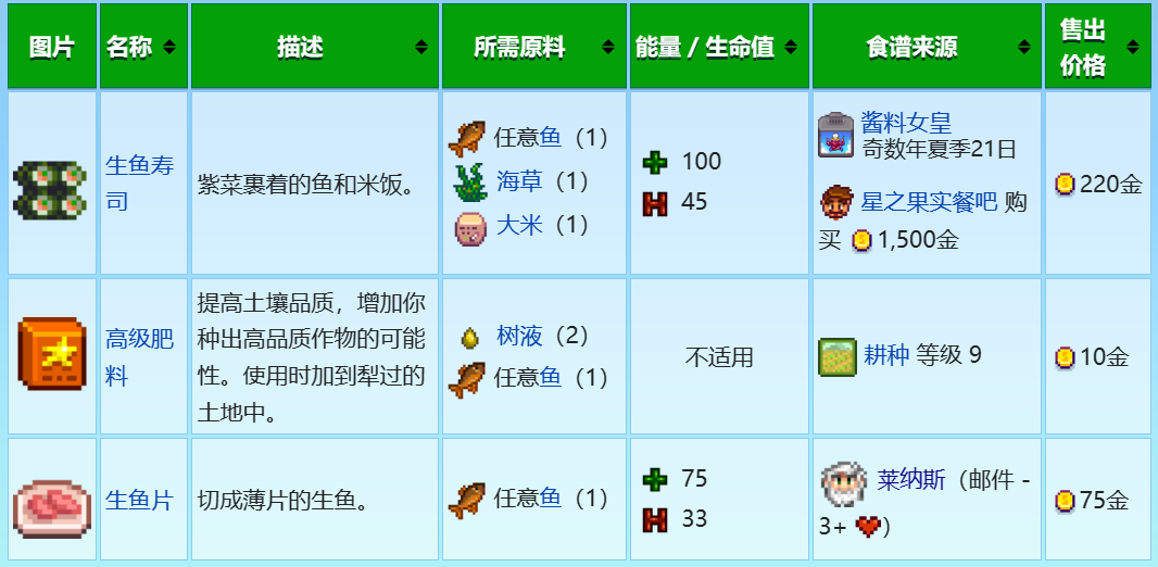 鲶鱼可以卖给威利或者旅行货车,每条鲶鱼的基础售价是200金,如果玩家有渔夫或者垂钓者的技能,可以获得更高的售价。当然也能做一些食物,如生鱼寿司,生鱼片,鱼汤等,这些食物可以恢复玩家的能量和生命值,或者作为礼物送给一些喜欢鱼类的村民,如威利,德米特里厄斯,艾利欧特等,能提升好大的好感度。