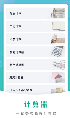 一款带有多种功能的便捷计算工具,其中除了普通的数字计算之外也提供了诸如姓名、房贷计算以及一些单位换算工具等。