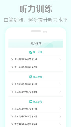 软件对高考应试听力部分进行了有的放矢地规划,通过每日的训练由简到难的带领大家适应听力题型,从而培养语感,加强听力识别精准度。