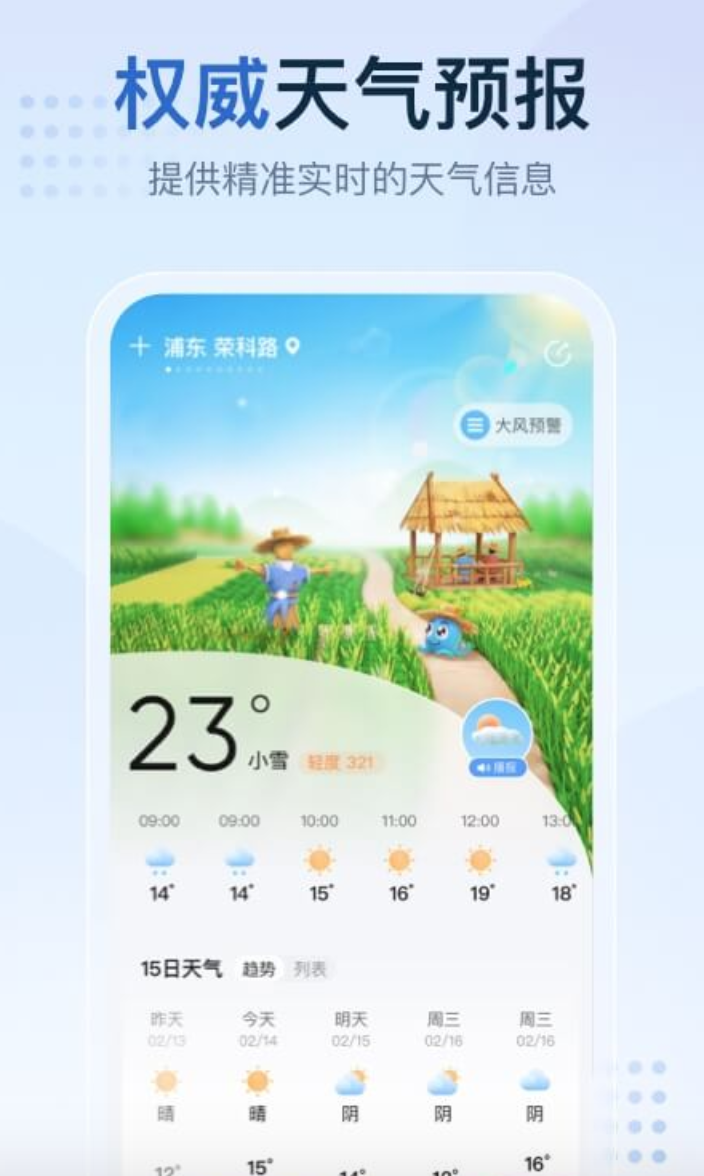 它提供了当前天气、每小时天气和十五天内预报,同时还有语音播报天气功能,让您可以轻松获取本期的气候变化信息。