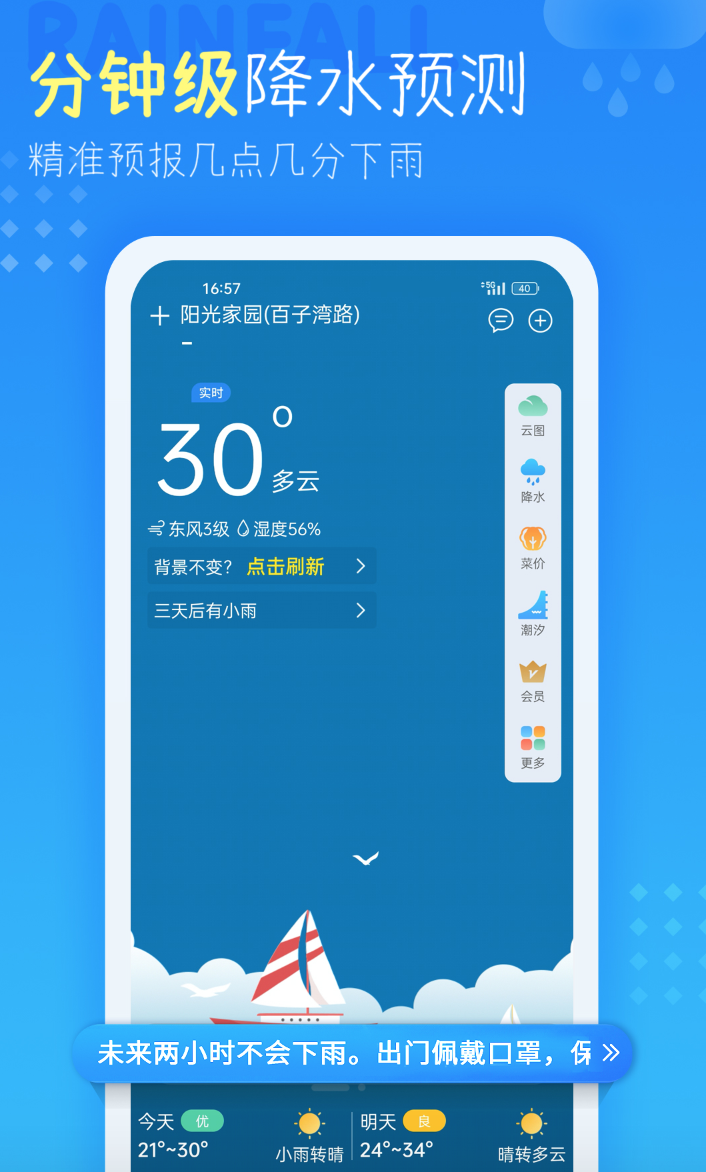 提供详细的天气预报、实时天气信息,并且还能提供一些特殊天气条件下的提醒和建议。有了它之后可以将白天黑夜尽在掌握。