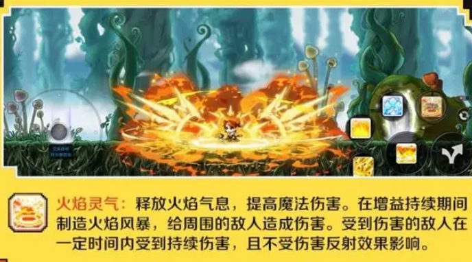 火焰灵气这个技能会向敌人释放出火焰气息,并且还有一定的程度能够提高自身的魔法伤害,在进行增益的期间还会制造出火焰似的风暴,只要在攻击范围内,那么敌人就会造成伤害。敌人只要受到了伤害,就会在规定时间之内持续性的掉血,这个技能是该角色的主要输出技能,冷却时间特别短,可以使劲的使用这个技能进行攻击。