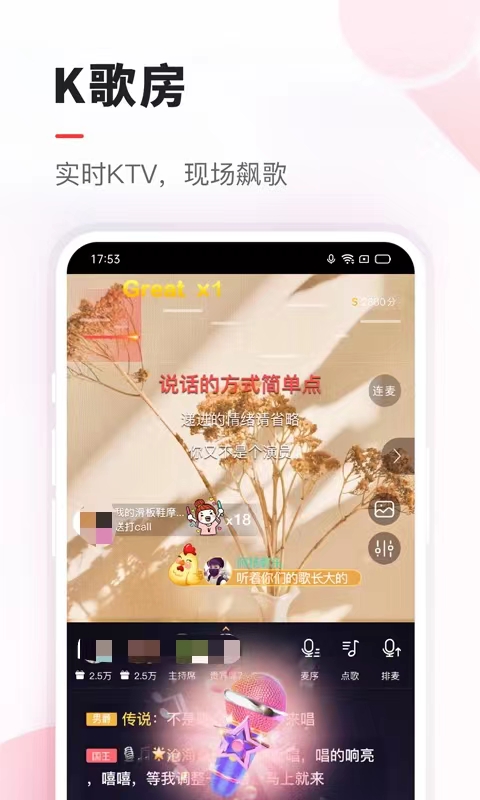 海量高品质伴奏,多款歌房玩法、唱歌、交友、玩游戏等。会根据自己的唱歌水平制定适合自己的唱歌方法,制定专业化的练唱课程,可以快速掌握K歌的技巧。有着多元化的活动常年陪伴着大家,这样在K歌的过程中也不会无聊。