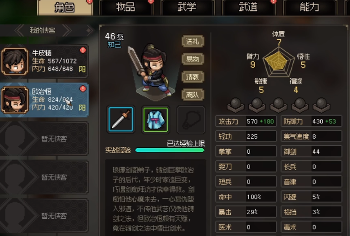 大侠立志传欧冶恒任务攻略分享完了,这个任务是让很多玩家都感觉非常苦恼的一个,但是想要顺利的完成这个任务,没有其他的捷径,需要玩家不断的在游戏中碰运气或者是寻找周围的角色进行沟通,如果可以顺利遇到这个角色,那玩家一定要抓紧机会,从这个人物这里获取相关的经验和秘籍,这样能够更好的帮助玩家提升自身的能力。