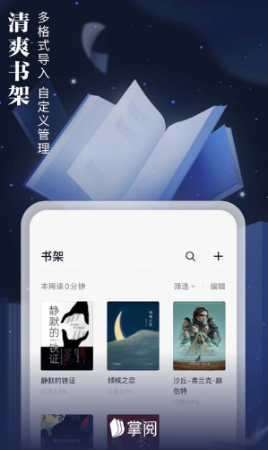 它的优势是可以自己导入书籍并且自定义书的封面跟标题,这样就可以创建出专属自己的书架了,有了它随时随地都可以享受无纸化阅读,让阅读更自由。