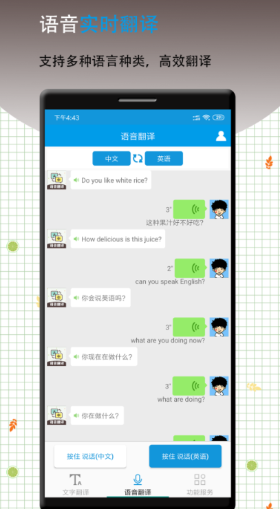 大家想要与外国人交流或者询问一些信息的时候就要用到此软件了,平台中有很多实用的功能。对于双方之间的对话,平台会实时翻译,而且支持很多种语言翻译。在交流的时候,平台会一边根据说的话同时翻译出来,相互交流衔接很好。