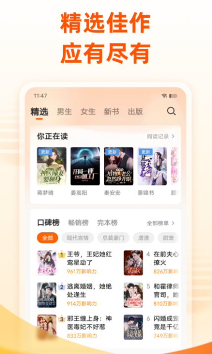 此平台最吸引人的一点就是免费了,大家阅读的时候不会中途收费,直接畅读正本书。平台中还有好多种排行榜,大家可以看到口碑榜、畅销榜、完结榜等。大家闲暇的时候可以从这几个榜单中找到喜欢的精品小说阅读。