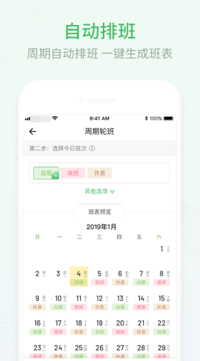 带有多种视图可以观看,应对一些周期性的工作时间可以实现多人的一键排班并且生成表格,而且会在日历模式下用不同的颜色标注出来。