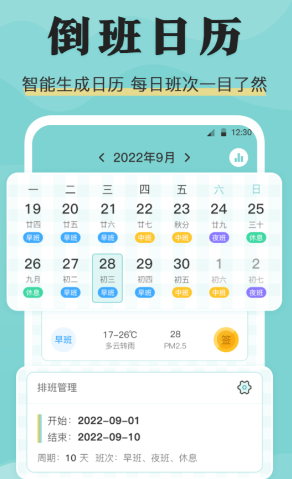 比较适合需要倒班的小伙伴来进行使用,输入条件之后就可以自动生成,在日历模式下通过颜色区分上班时间,让我们不再遗忘或错过。