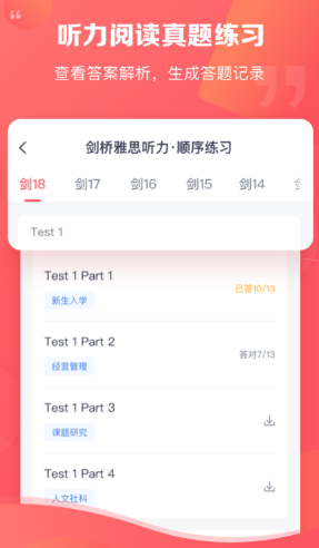 从听力、口语和词汇量等角度切入,通过大量的真题累计帮助我们熟练题型和考点,从而稳步巩固英语能力。会对做题记录进行分析,将错题汇编在一起着重强化提升。