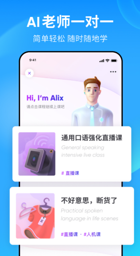 主要还是面向口语学习和能力提升,带有智能AI教师,可以随时随地让我们享受到一对一的对话训练和教学,并且自动检测纠正语法以及发音错误。软件还提供了海量的直播课程,即时把握考点动态。