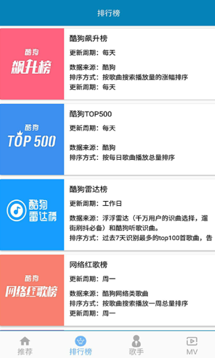 虽然界面上看起来比较简陋但是内容却一点不含糊,软件除了带有海量的歌曲可以直接收听之外,也会收录很多知名平台的权威榜单,帮助我们快速发现好听的音乐作品。