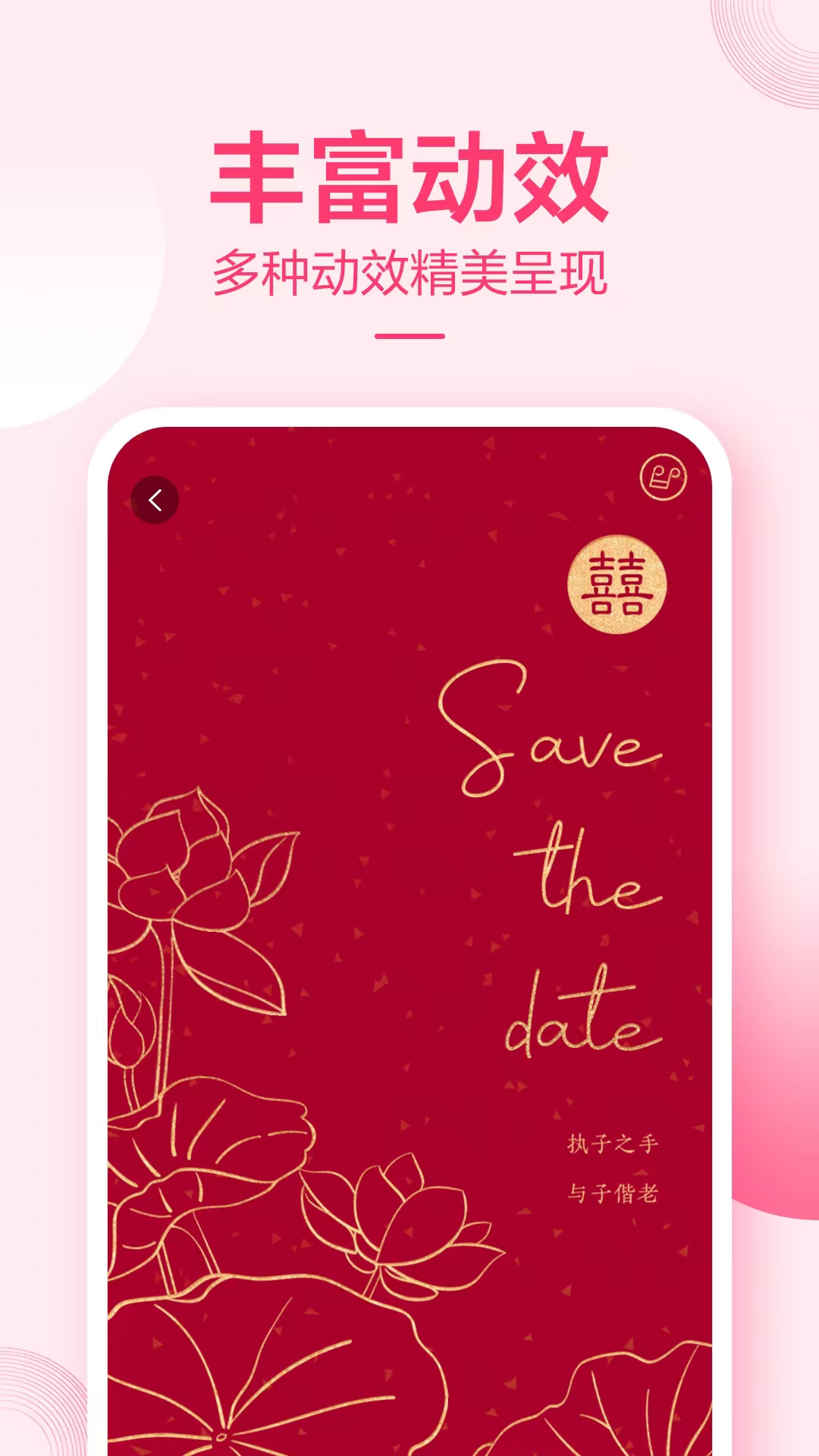 这是一款可以制作结婚电子请帖贺卡,它不仅能快速的制作出你的请帖,还有精美的许多模板,多种的动态动效和专属定制。可以挑选自己中意的婚纱照,编辑好属于自己的爱情语言,自定义背景音乐,三分钟就可以制作完成,方便简单。