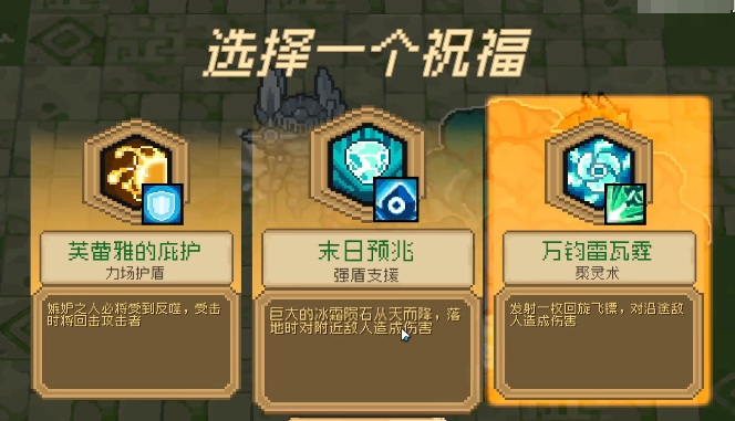 那么关于元气骑士前传祝福选择攻略的内容到这里就全部结束了,这些祝福在选择的时候还是需要考虑最适合的那一个,毕竟它本身是对于你技能的一个强化,所以需要综合考虑很多因素,大家学会的话就赶紧去选择试试吧!