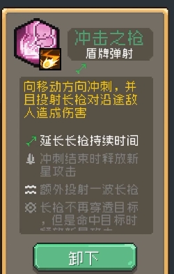 第二个比较推荐的祝福是“冲击之枪”,它强化的是“盾牌弹射”,这个祝福的效果也非常给力,可以直接让你多一段位移,而且途中还可以投掷长枪攻击一条的敌人,这个长枪在祝福经过提升之后还能延长持续时间,以此贯穿更多敌人,此外,后续的提升还能令其解锁“释放新星”,“额外投射一次长枪”的效果。