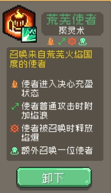 然后强化了“聚灵术”的“荒芜使者”也是个人比较推荐的一个祝福,它的效果是召唤两个火焰使者,这个使者本身的伤害不错,而且还能够充盈决心来提升自己的战力,后续经过提升该祝福所召唤的使者还会获得普攻附带焰浪的强化,提升满后该祝福更是可以额外召唤一位使者,并且召唤瞬间还能施放一次焰爆!