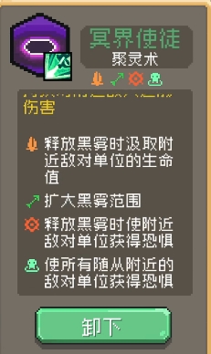 最后推荐的这个祝福是“冥界使徒”,它也强化的是聚灵术,其效果是召唤一片黑雾持续伤害范围内敌人,经过提升可以解锁额外的吸血,扩大范围以及恐惧效果,可谓是兼具AOE伤害,续航以及控制!