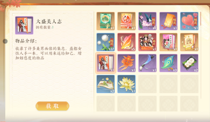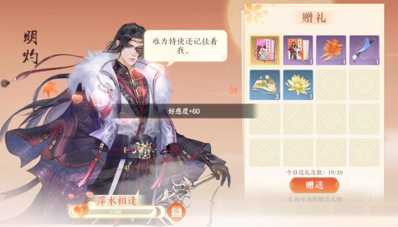 由于游戏刚刚上线不久,很多的神秘道具小编也没有获得,这些道具是大家通过日常任务就可以获得的,可以优先赠送给明灼,其实大家还可以通过一些人物性格来判断明灼的喜好,比如明灼是一个武功很高强的人;