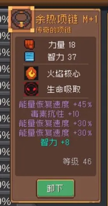 余热项链:这是一个传奇品质的项链,其基础属性中的力量与智力都达到了不错的水准,当然,它最令人看好的还是其技能,火焰核心可以让你在火焰元素层面获取更强的抵御能力和伤害输出能力,另外生命吸取也可以充分提升角色的续航,而且它可以强化多次以此来获取多个属性词条,这些词条如果能够刷到上图所示的能量恢复速度和智力,那么它的续航和输出作用都将被进一步放大。