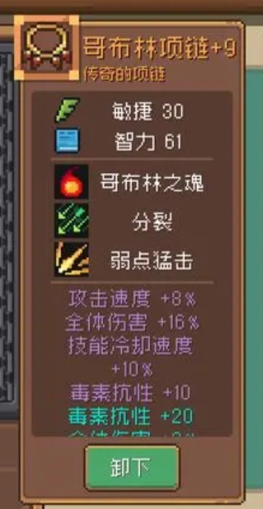 哥布林项链:再给大家推荐的这个项链也同样是传奇品质,它的基础属性也是敏捷和智力,是一件典型的法系装备,不过需要注意的是该项链属于哥布林系列的装备,所以对于融合了元素职业的射手来说也同样适合。