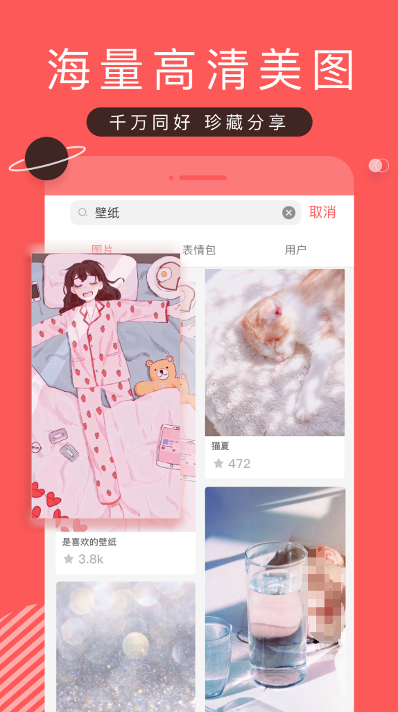 宠物图片、美食图片、风景图片、美女图片,这款软件全部都涵盖到了!只有大家想不到的主题图,没有大家找不到的美图!只需要轻轻点击搜索框然后输入,就能找到喜欢的高清大图了。