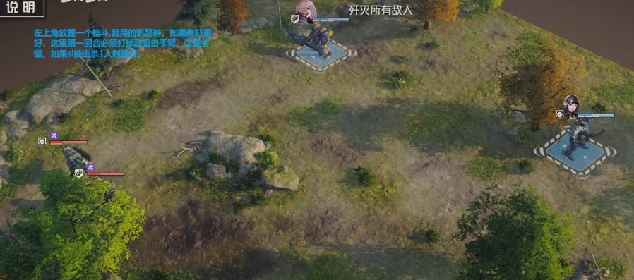 如果安娜出现危险是需要保护一下的,左上角的话大家就放凯瑟琳,这个角色在上面其实是可以放养的,主要就是做一个牵制作用,能打的时候就打,如果打不了的话,只要血量在安全线上就可以了,然后基本一个回合集火一个小怪就可以成功通关啦。