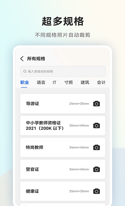 打造专属于你自己的美丽证件照,有教师资格证和英语四六级等等的尺寸可以直接设置,一般情况下的大型考试场景所用到的尺寸和规格都可以用这个软件来制作证件照。