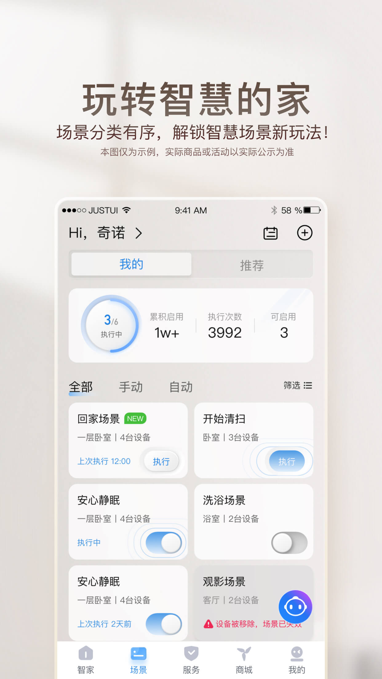 软件的目的就是让用户能够体验到更加便捷和智能的生活,根据自己的习惯和偏好设置不同的场景联动方式,能一键触发多条随心定制好的系统。除了控制家电之外,还拥有智能食谱,精选商城等相关服务,让生活变得更轻松。