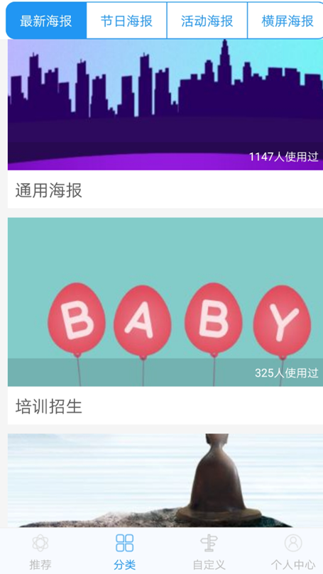 又是一款强大的平面设计工具,核心的功能是制作海报,在设定好尺寸,运用多种背景素材添加上文字之后也可以用来制作精美的名片,而且清晰度相当不错。