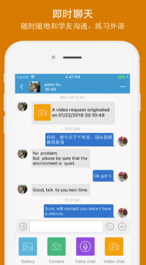 跟各个国家母语者进行交流,用户可以使用双语交流,边学外语边交友,支持英语、俄语与欧洲小语种跟读学习,海南跟真人用户进行音视频聊天,面对面练习。