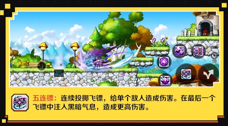 技能方面,其中比较关键的有三个,第一个是“五连镖”,该技能可以连续投掷多道飞镖,虽然只能对单体敌人造成伤害,但每一镖的加成倍率都非常不错,而且最后一个飞镖还有额外的加强,不仅能够注入黑暗气息,而且伤害也会得到一定程度的加强!