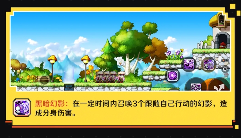 第二个比较核心的技能是“黑暗幻影”,该技能可以直接召唤三个分身,分身会持续一段时间,这段时间内它们会跟随自己行动,并且也能一起攻击敌人以此造成伤害,这些分身的属性是非常高的,所以召唤出它们后刷怪的效率相当于得到了成倍提升。