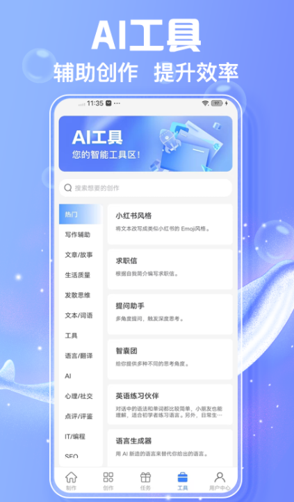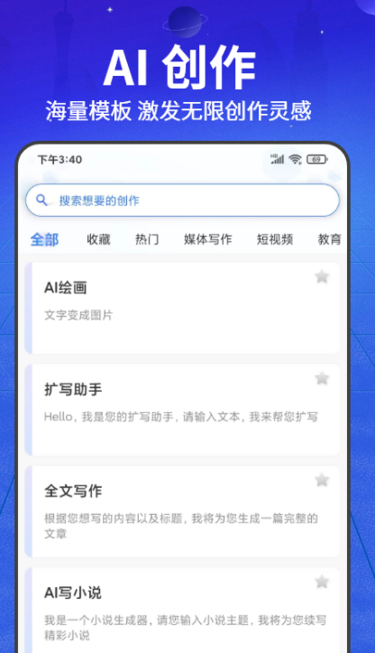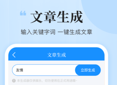 这款应用就是属于一键生成出你所需要的内容文案来,它会有很多提前好的预设风格,比如有的是祝福语、上台演讲稿、文案写作等等,会根据你所需求的演讲环境不同来自动变化生成的风格,生成之后导出就能直接去引用,且制作出的文章普遍原创度都相当高,都能根据你的主题来去拟定风格。