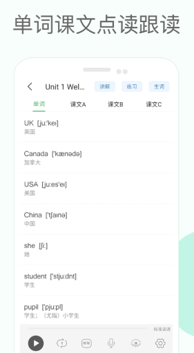 软件核心的功能就是带有课文的点读跟读,而且还带有多种不同年级和教材版本可以自由选择,软件的操作十分简单,直接点击文中对应的内容就可以播放音频素材。
