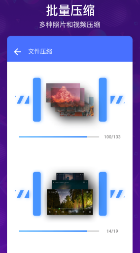 能够批量地导入手机上的照片和视频进行压缩,不会对视频时长以及媒体文件的画质造成损伤,而是通过算法和转码来进行容量精简,软件处理的速度非常快,而且还支持后台运行。