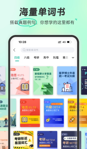 这里带有上千本不同的词汇书籍可以一键获取,包括学龄阶段教材内容以及大学英语水平等级考试的考纲范围。通过一些趣味性的习题和权威的单词释义、例句让我们快速掌握用法。